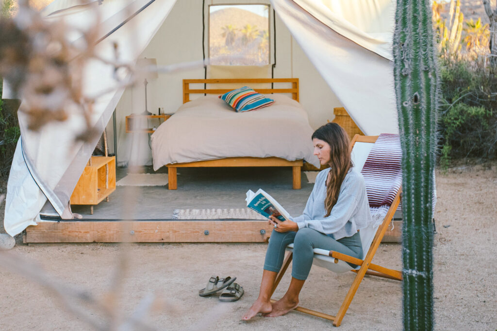 A comfy canvas glamping tent, thoughtfully furnished and designed for peaceful solo rest.